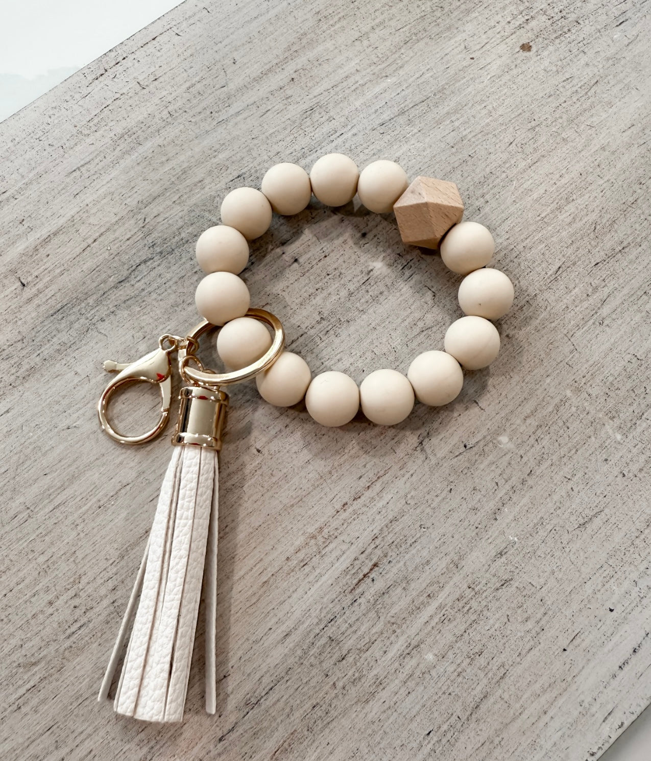 Bubble bead, stretchy keychain wristlet with lobster claw clasp and tassel.