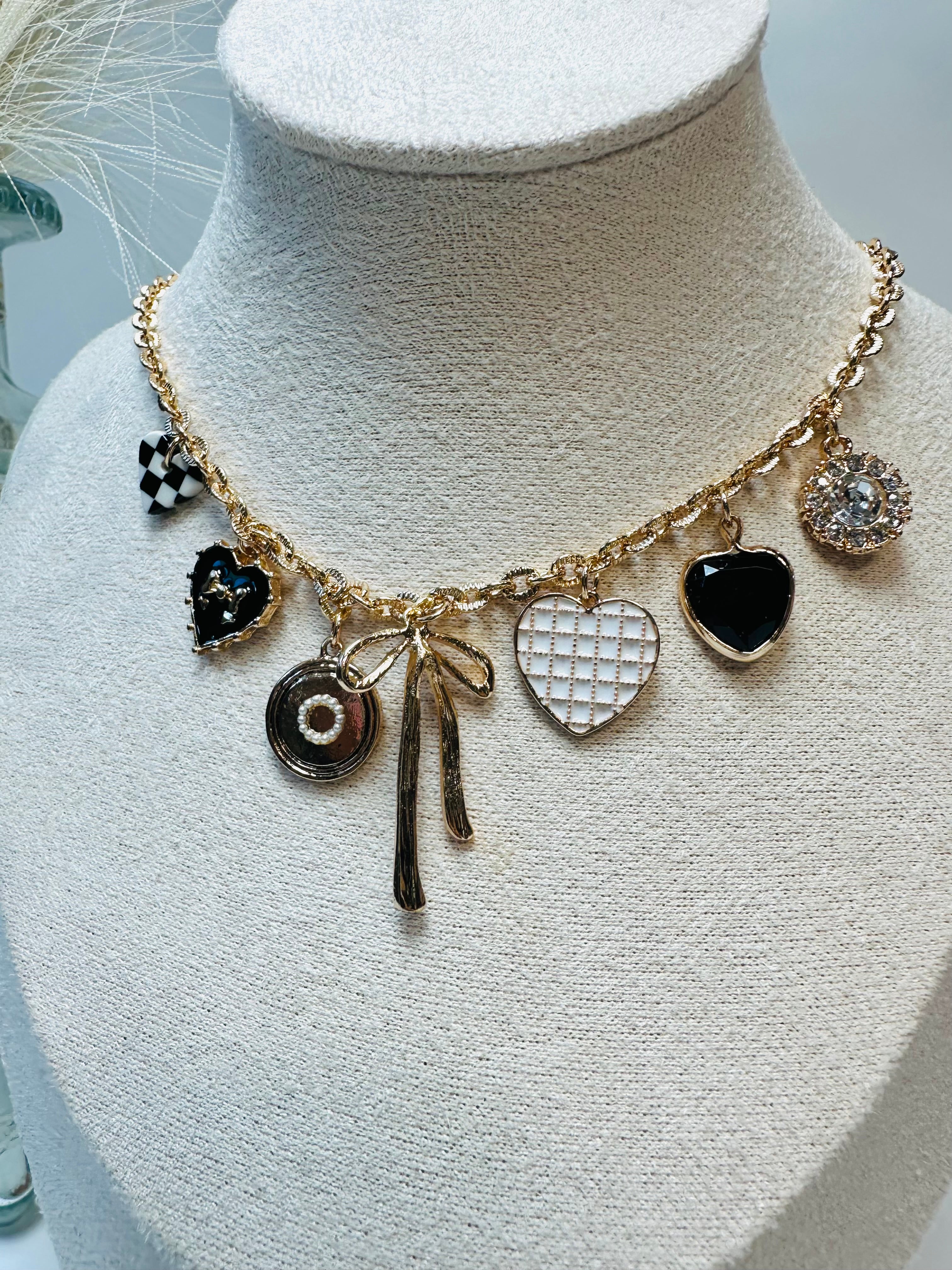 Charm Necklace a delightful mix of charms, including a Bow, Checker Heart, Rhinestone and heart charms, all beautifully strung on...