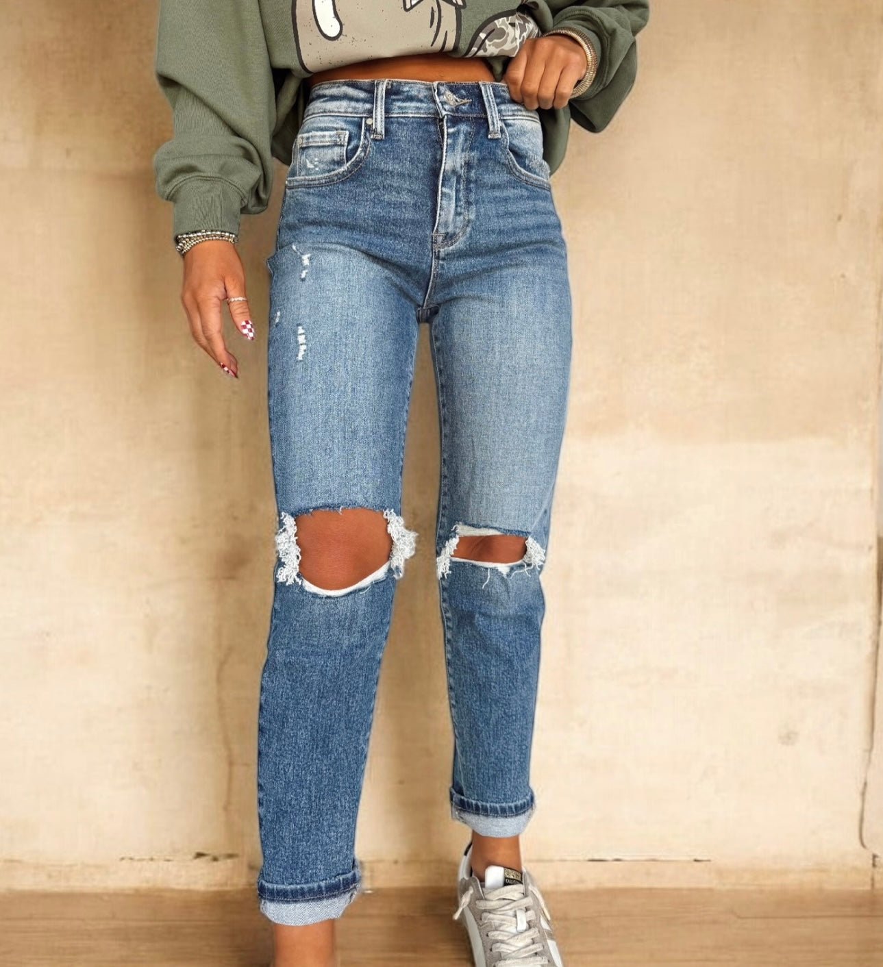 High standards distressed mom jeans