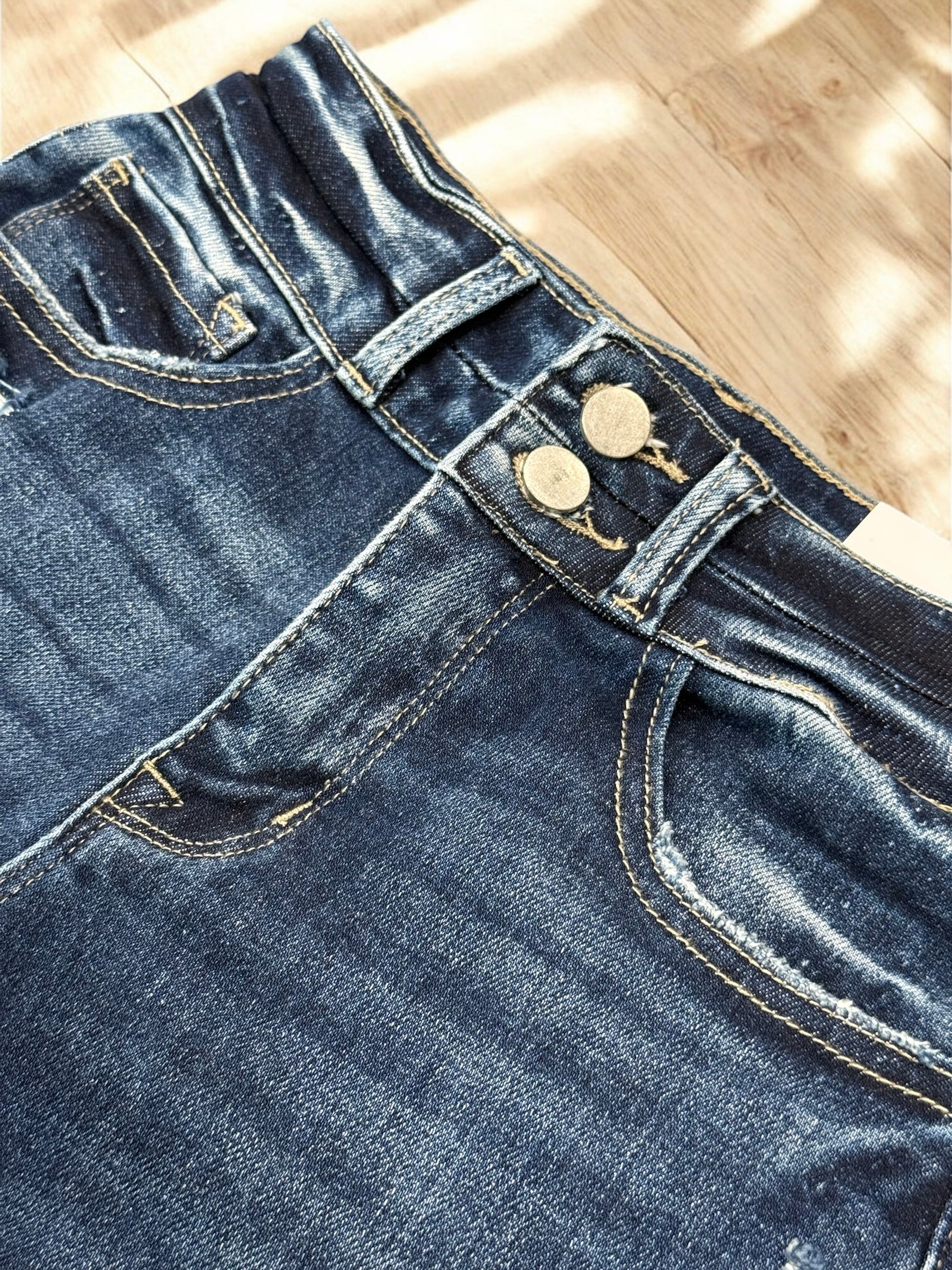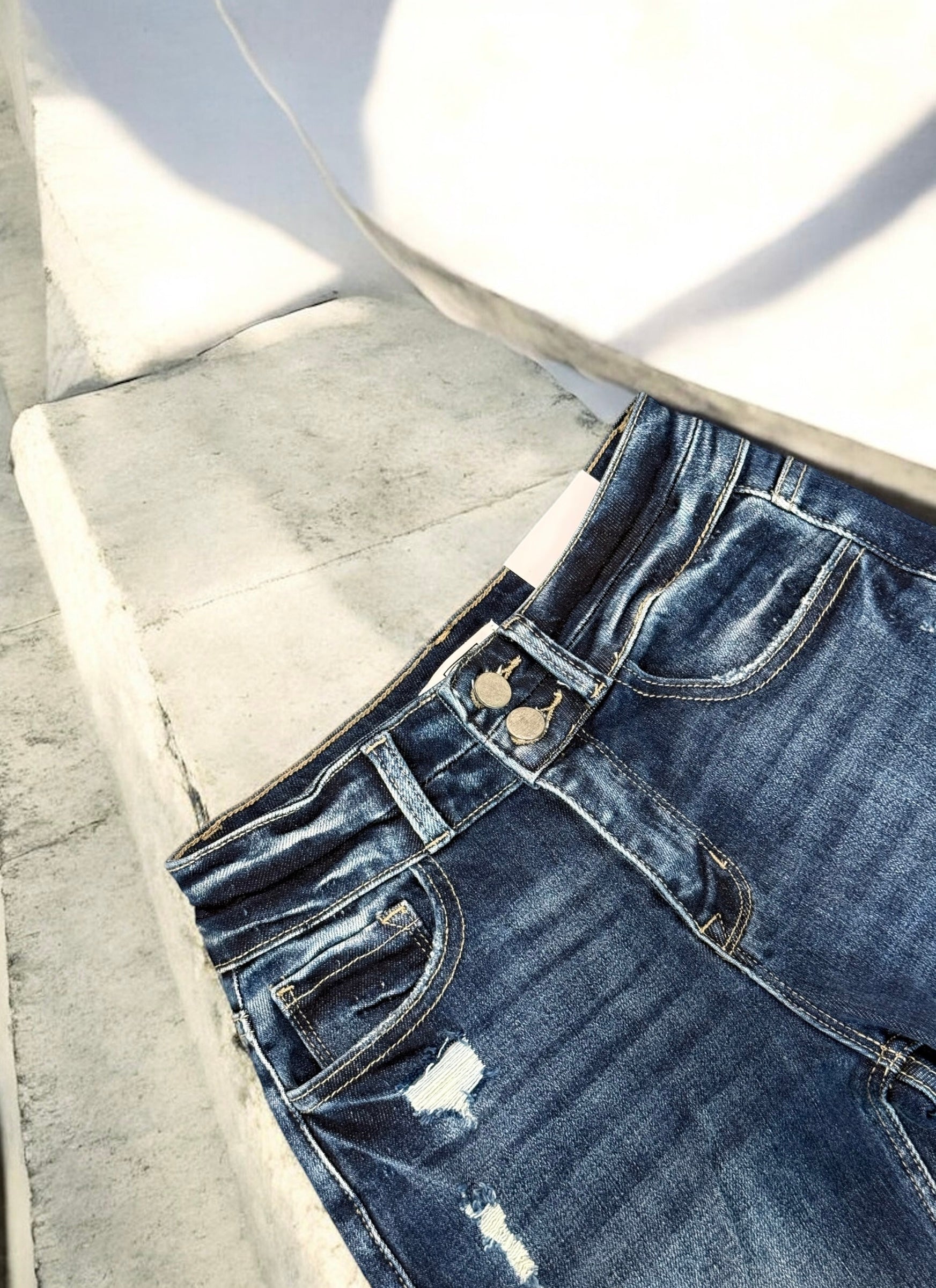 Introducing our newest jean, the DARK WASH Route 507 Milestone Distressed Denim Flare Jeans. These jeans offer both style and comfort, making them a must-have in any wardrobe. Plus, by purchasing from us, you are supporting our small businesses. Experience the perfect blend of fashion and support with these jeans!