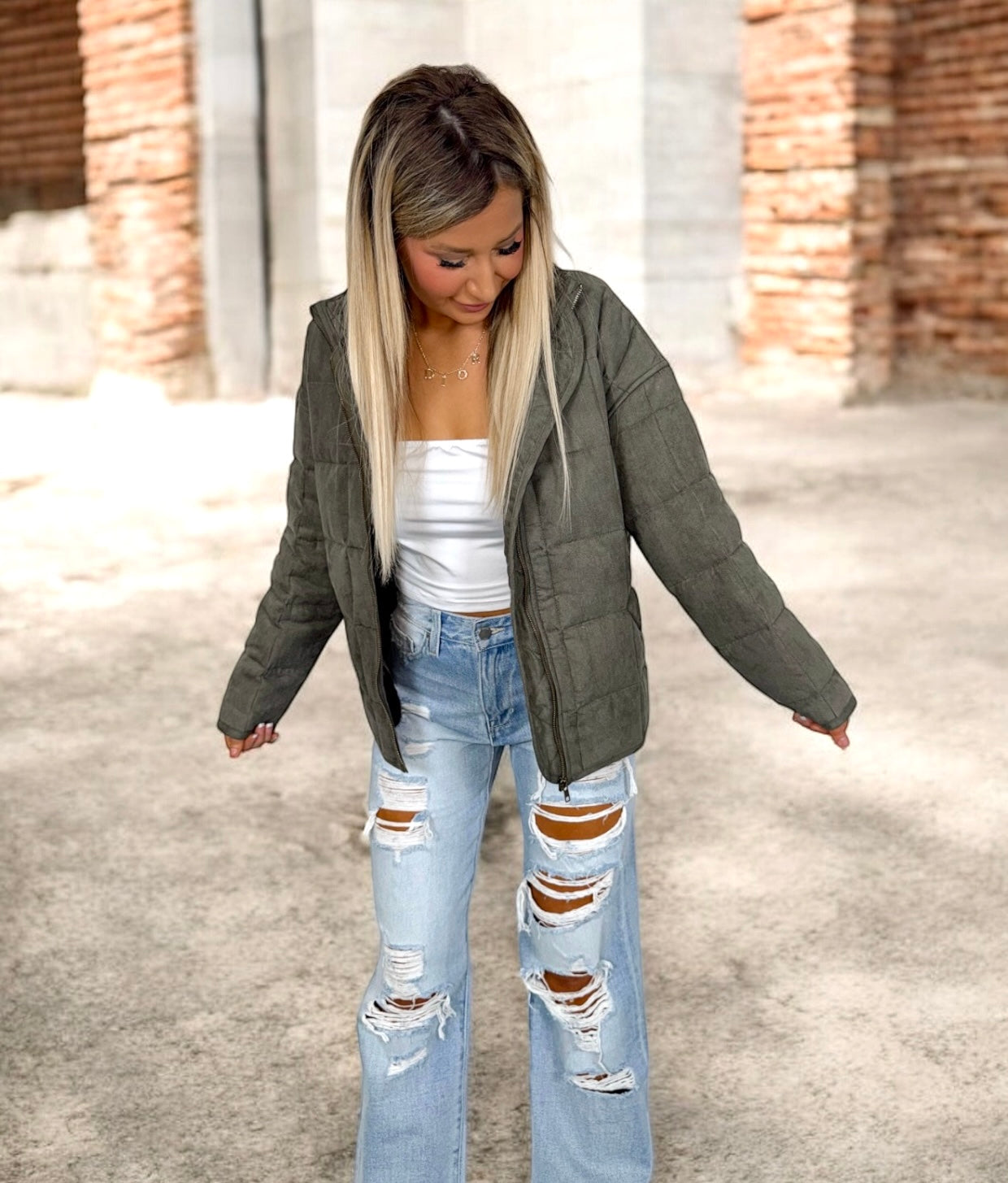 Details: Quilted design, zip-up front, POCKETS