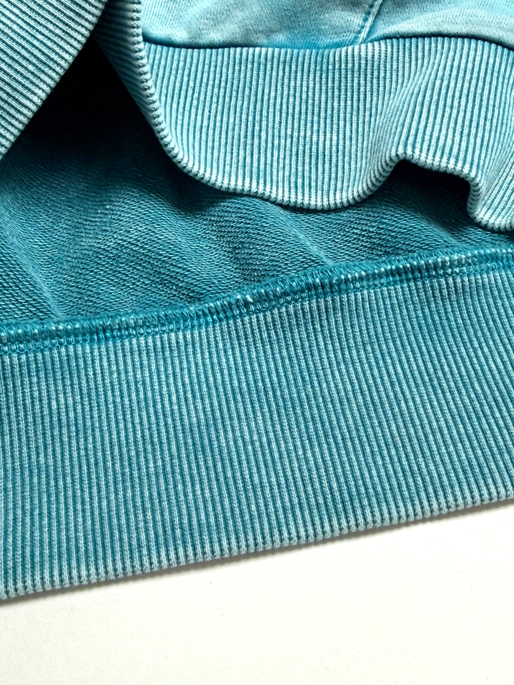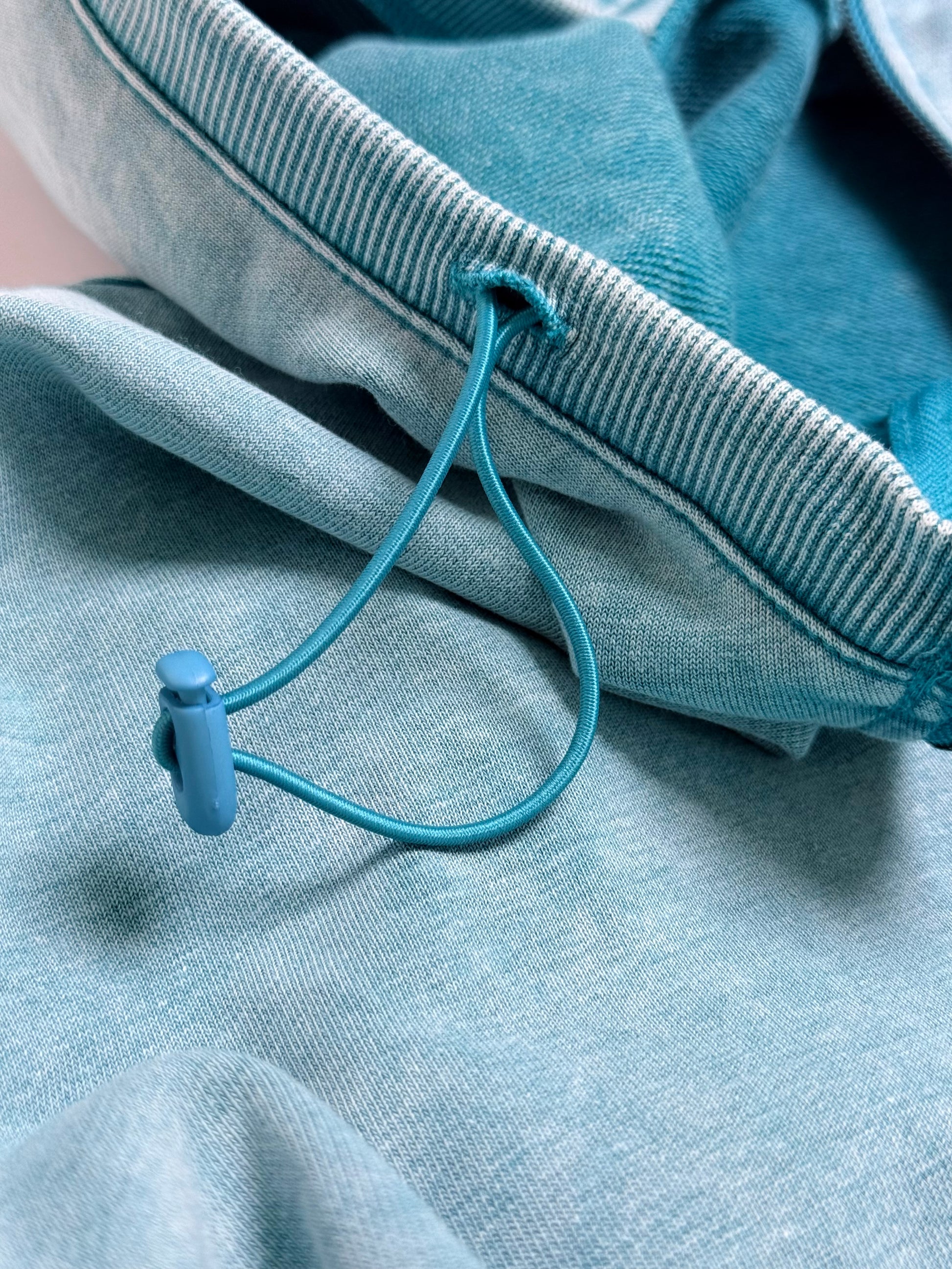 Details: cuff knit sleeves, mineral wash, half zipped front, drop shoulder and pouch pocket details