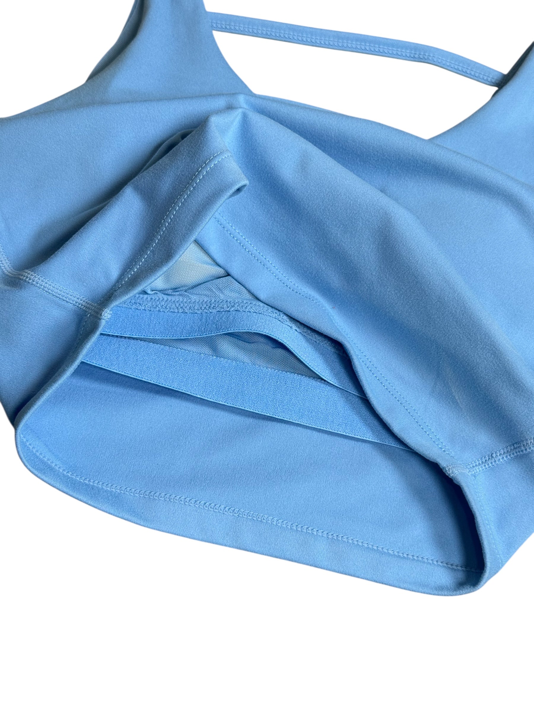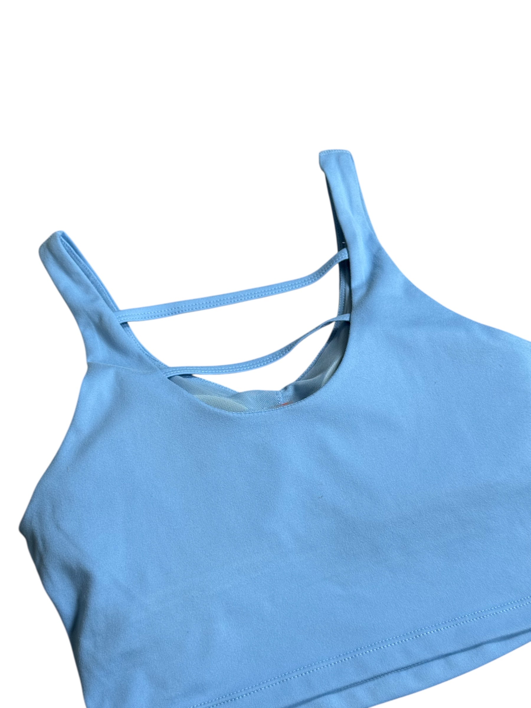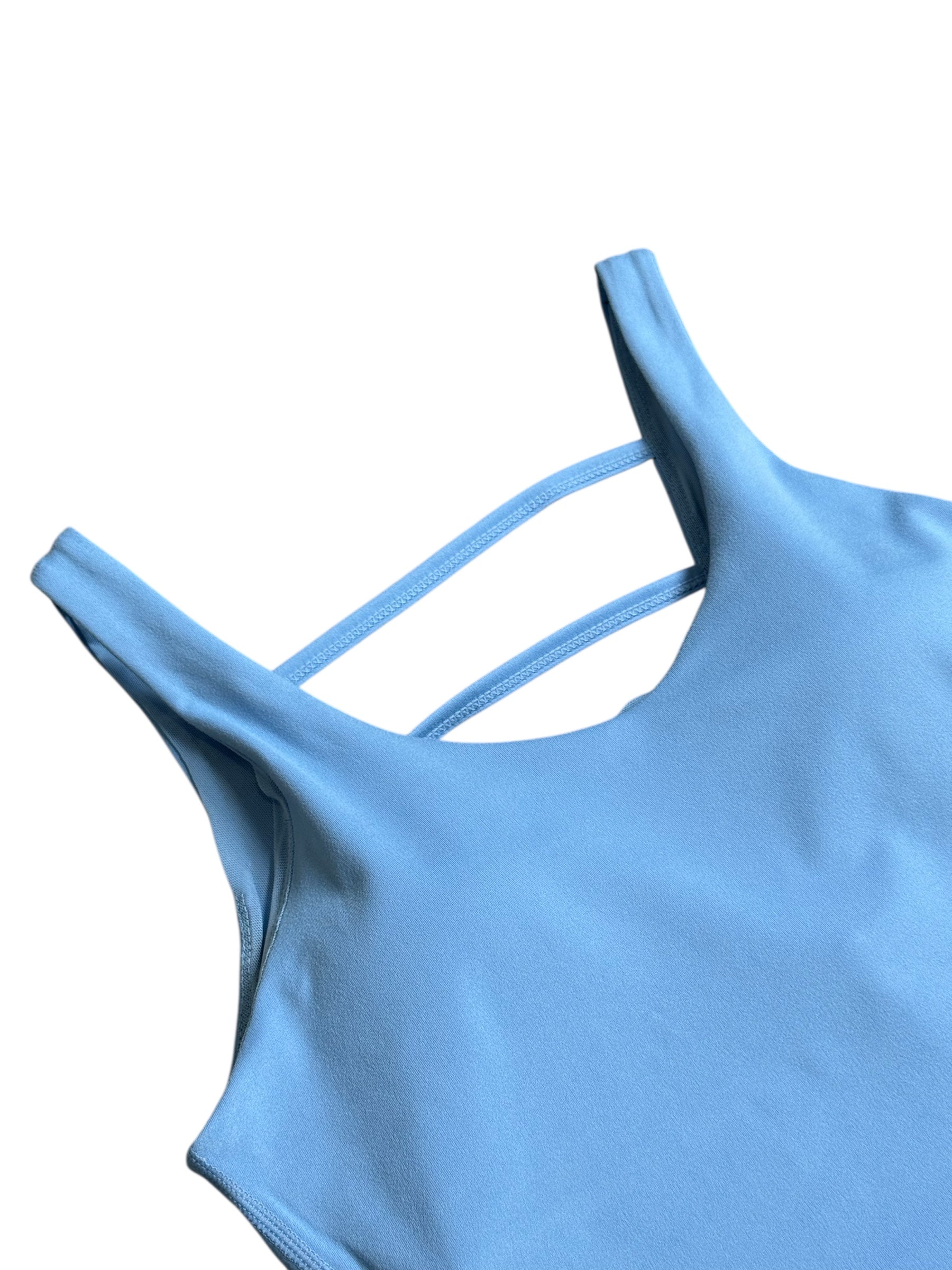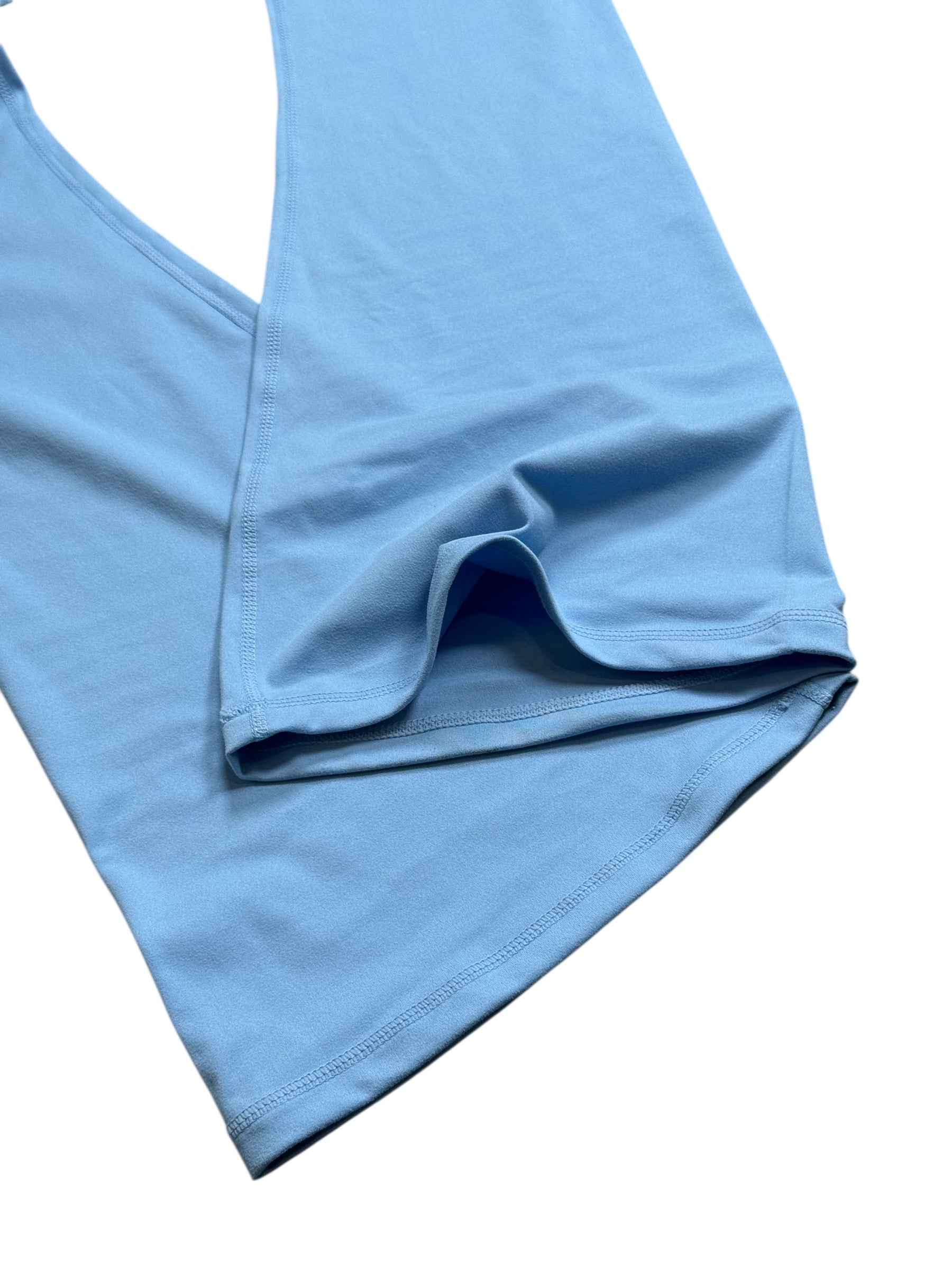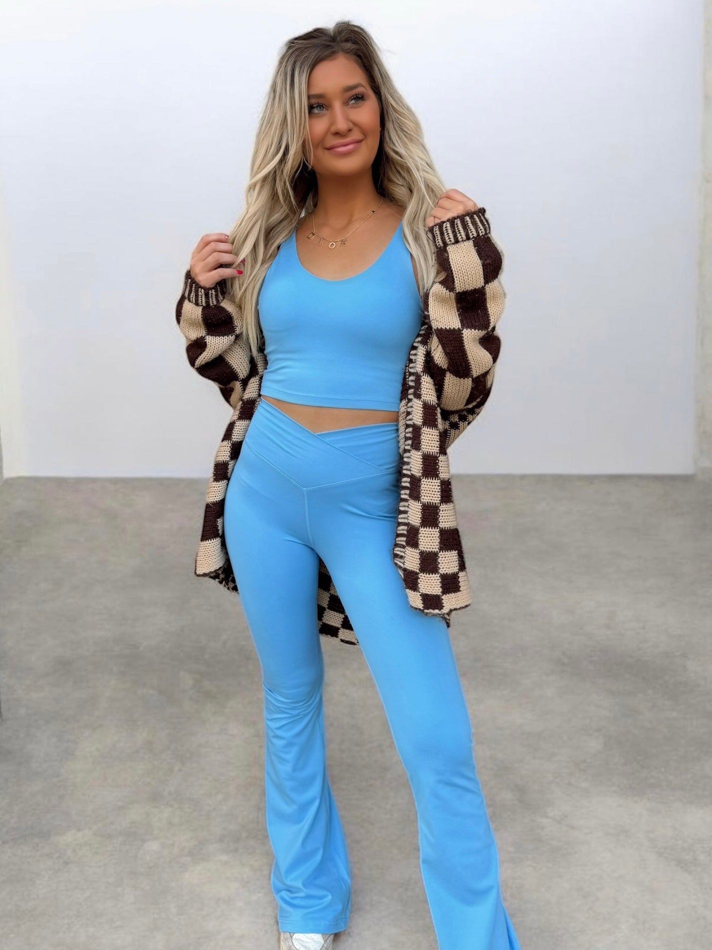 Details: mid-length tank, built-in bra, high waisted leggings, crossover waist, flared leg cut