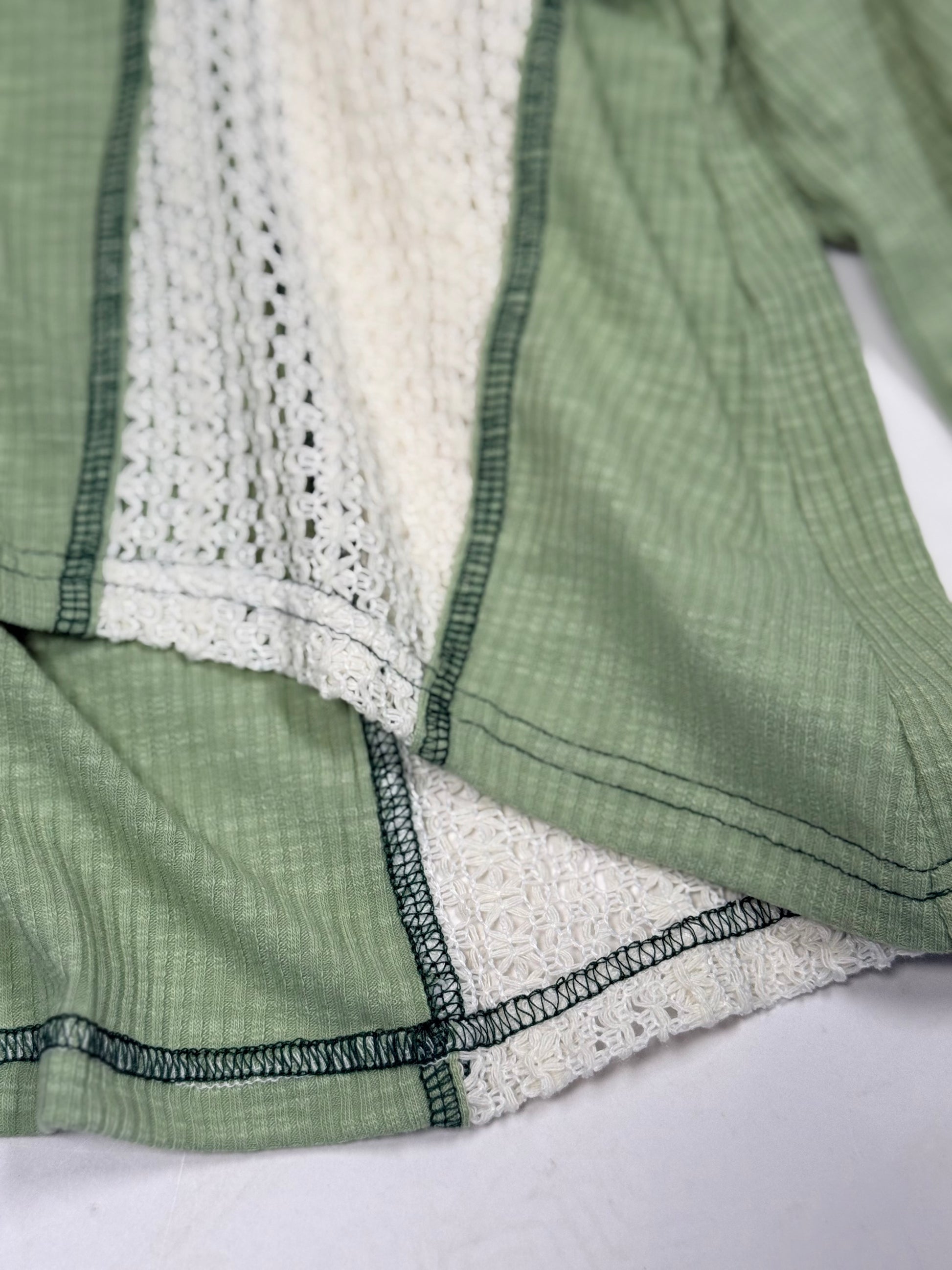 Details: crochet detail and high low design, exposed seam and raw hemline