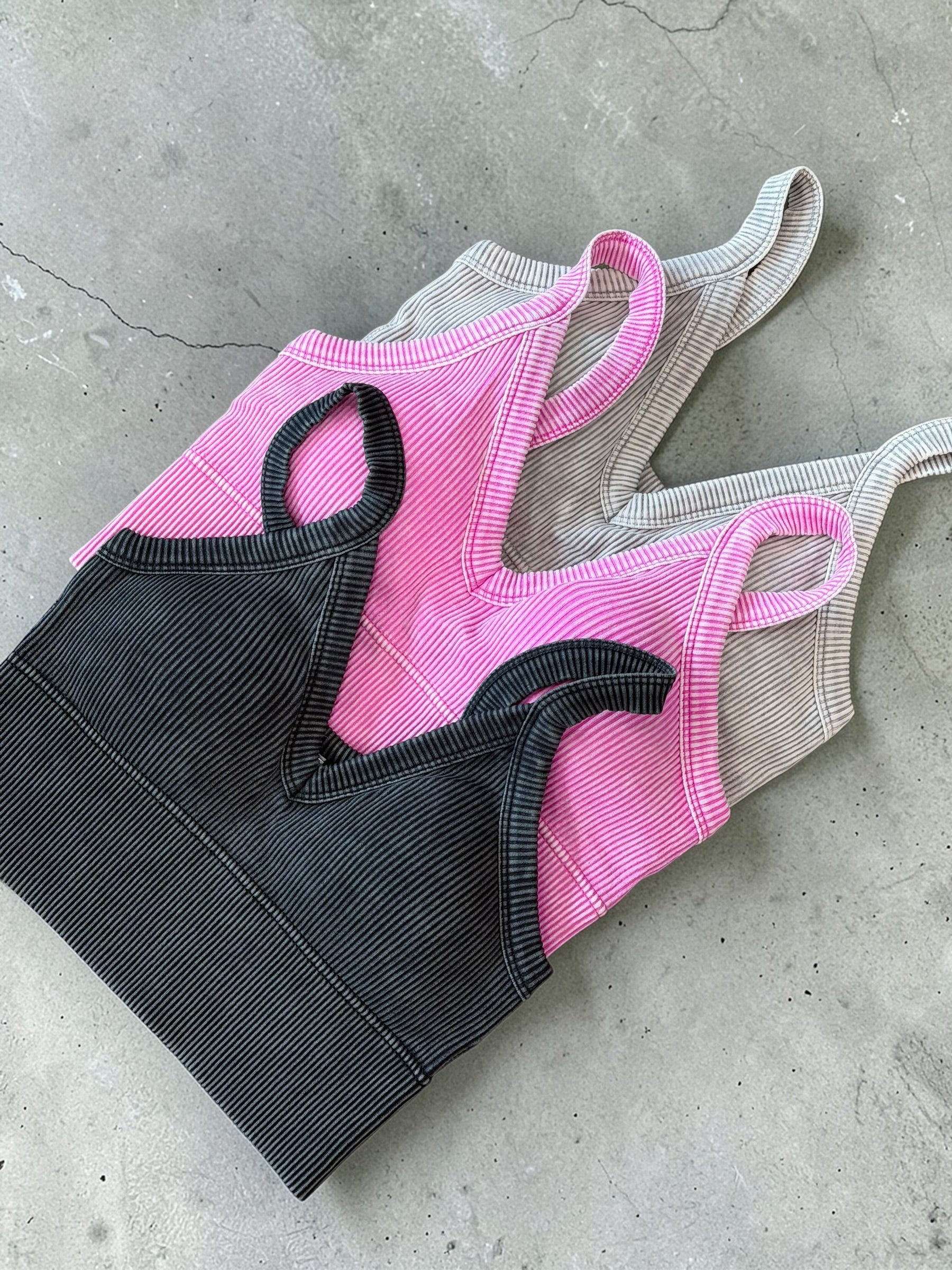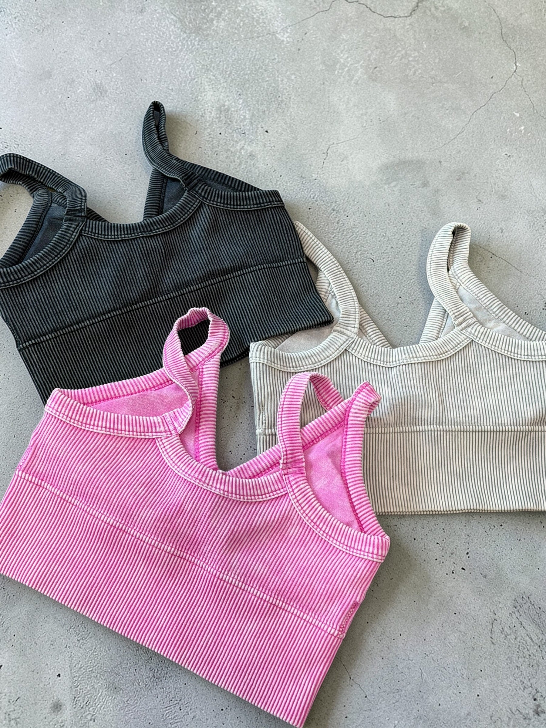 Details: STONE WASHED V-NECK SEAMLESS CROPPED BRA TOP, Removable Pads